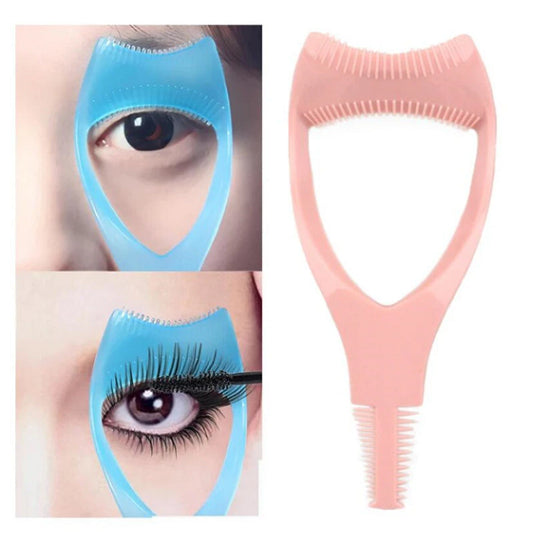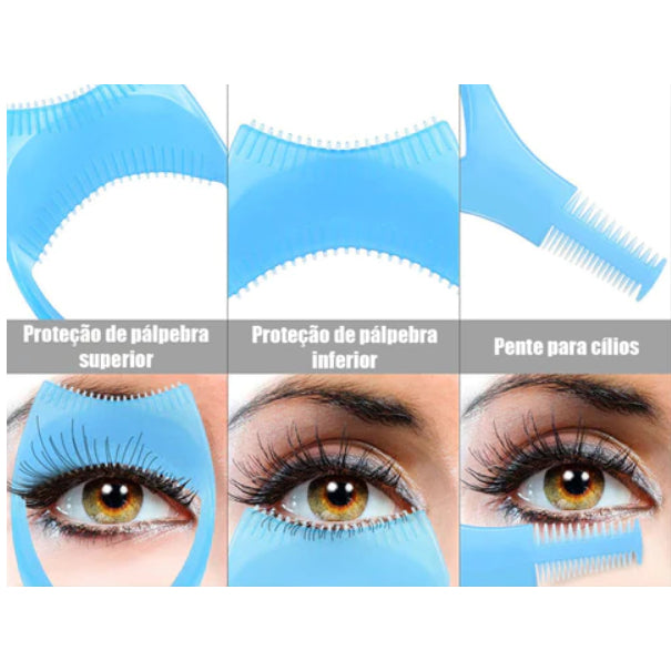 Encaixe os cílios superiores na parte interna e os cílios inferiores no topo do protetor para a aplicação de máscara para cílios. Aplique a máscara de sua preferência quantas vezes quiser e para finalizar você pode pentear seus cílios para um excelente acabamento.